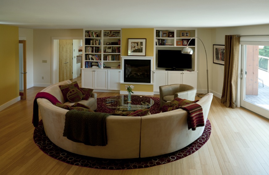 Preserving the core of the original house, the new design added a floor for a master bedroom suite, renovated the existing floors into modern flowing spaces, changed a concrete ramp into a curved-wall media room, and created a covered walkway and stair entrance from a new garage down a rocky, inclined site.